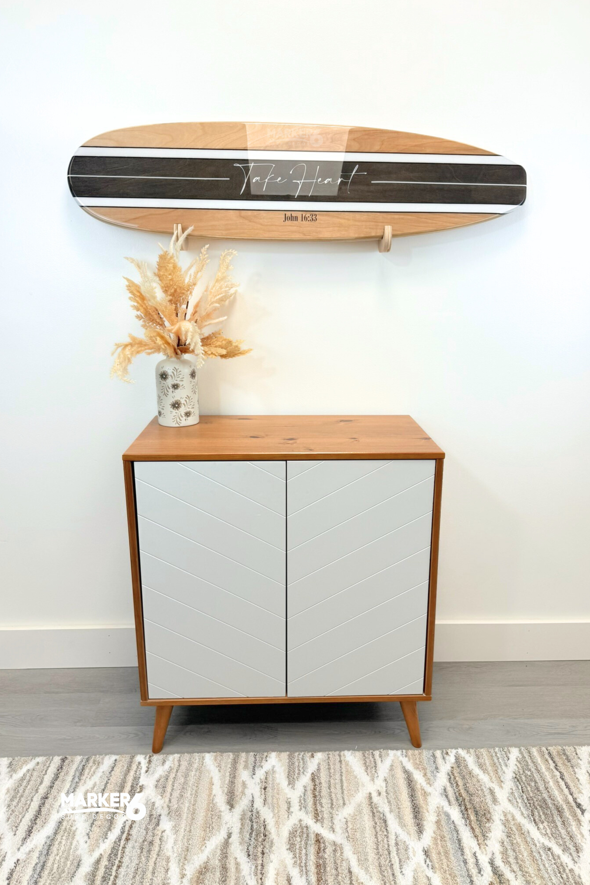 Personalize it with your own text - a family name, favorite quote, or special place, to create a one-of-a-kind statement for your home, beach house, or business. Each surfboard is carefully finished with an glossy epoxy finish to highlight the natural wood grain, making every piece unique.