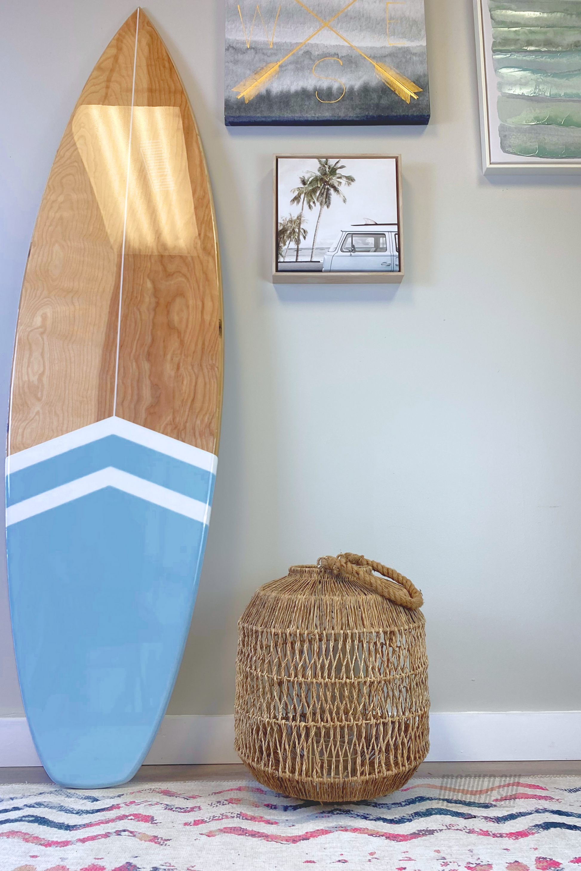 The Local Surfboard Wall Art is made of beautiful natural birch furniture grade plywood. It features a crisp white stripe down the center, white chevrons and your choice of color on the bottom. The board is finished with a high gloss epoxy coating and comes with the hanging hardware installed on the back.