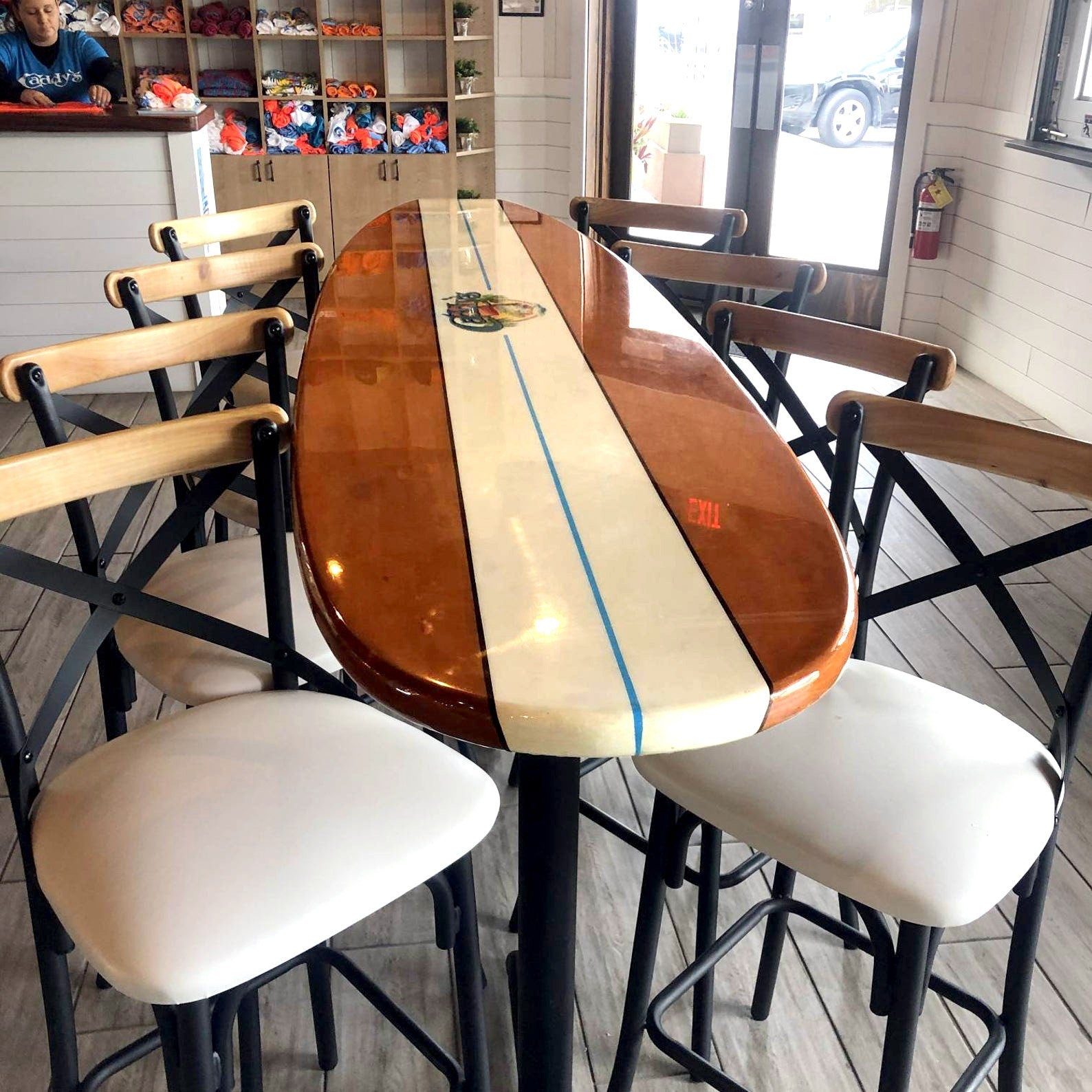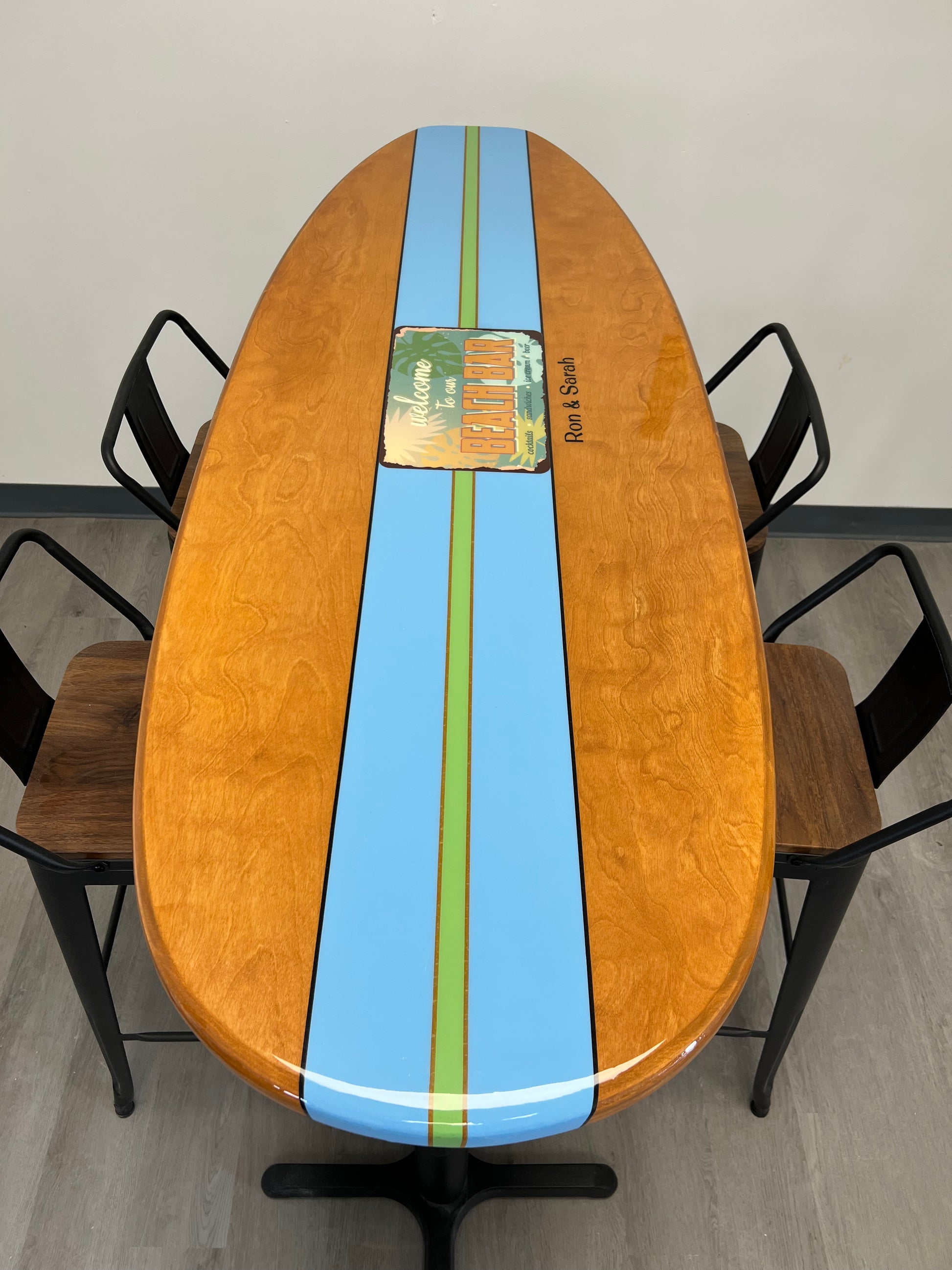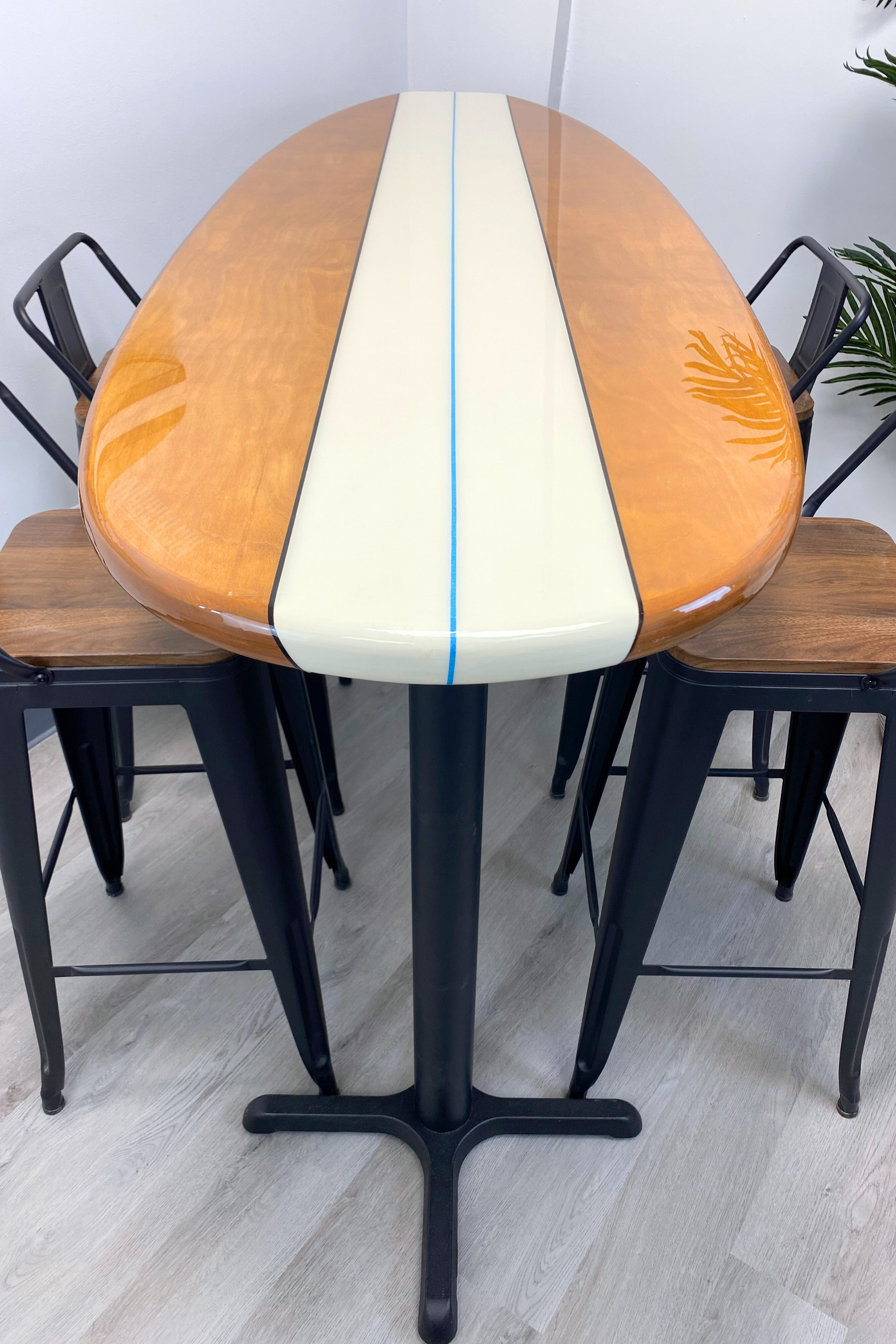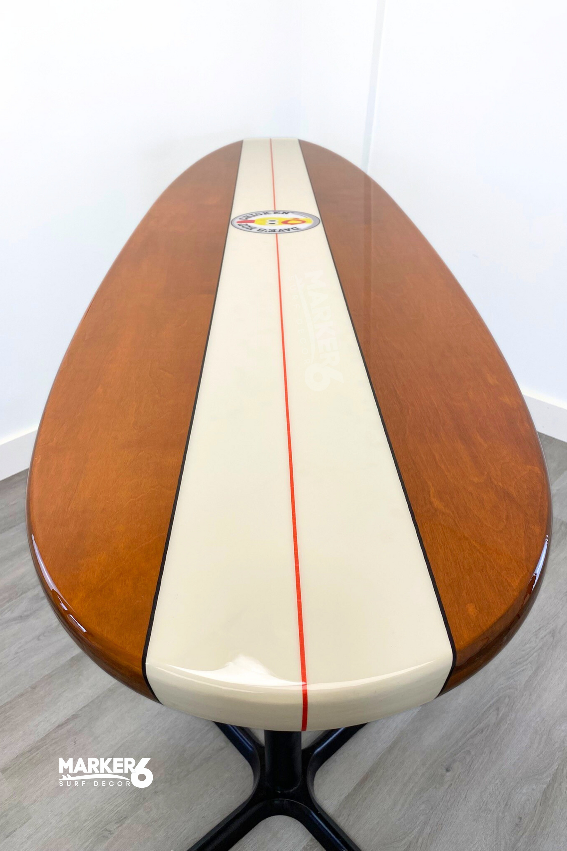 The Original Padillac Surfboard Bar Top is perfect for homes, restaurants or bars. Because you have the option of dining, bar or counter height, in addition to 4 tables sizes, you really can use it anywhere. We take our time applying our house-made stain making sure the rich red-brown color saturates the wood. We then hand paint an off white center and add crisp black pinstripes. The center pinstripe is your choice. Add a logo or not, either way it's gorgeous. All finished with a high gloss epoxy coating making it durable for dining and play for years to come.
