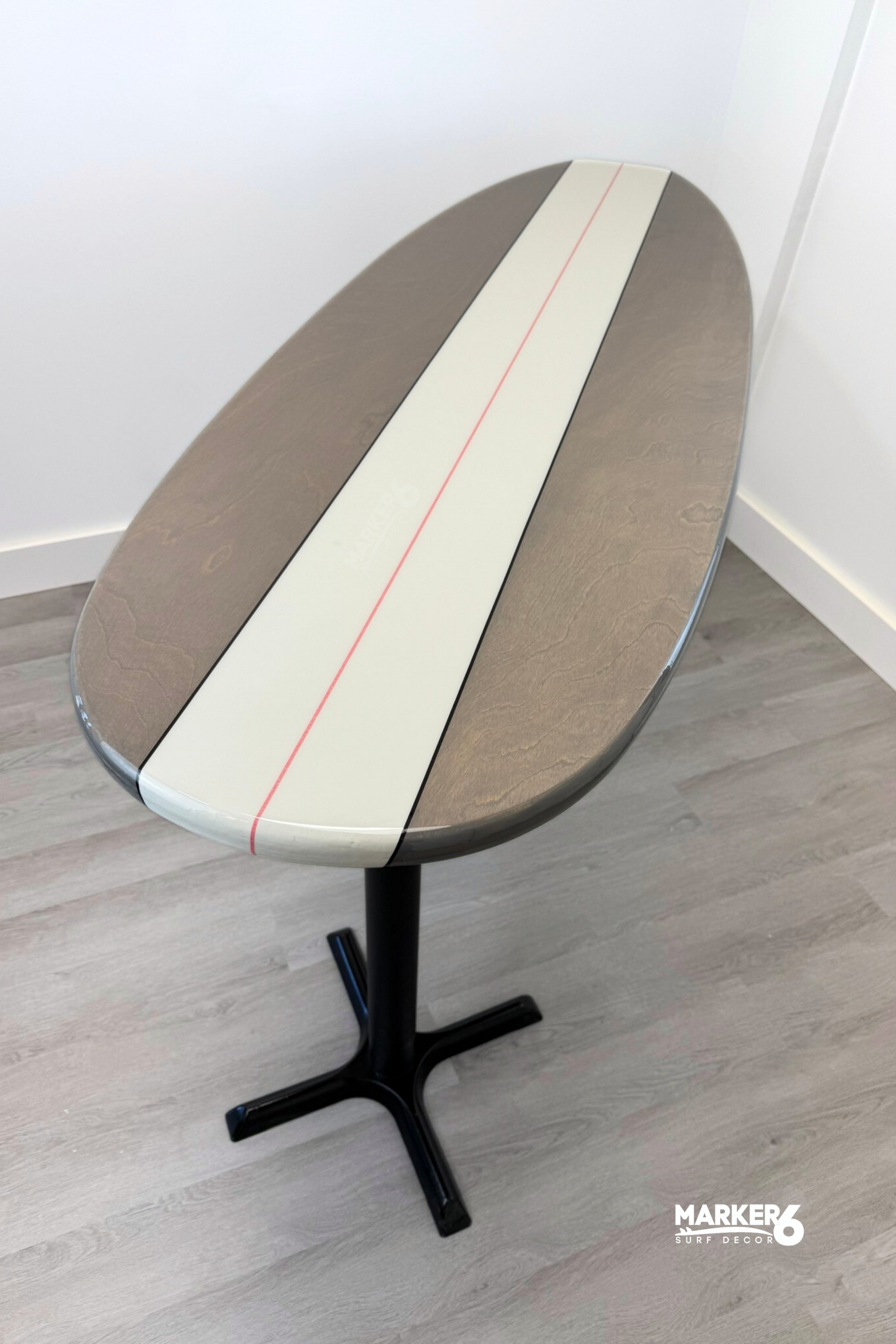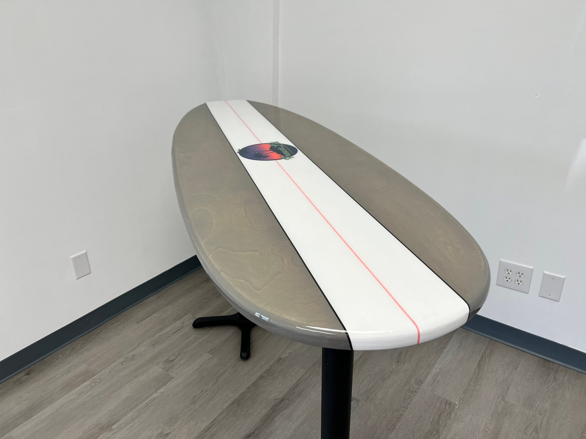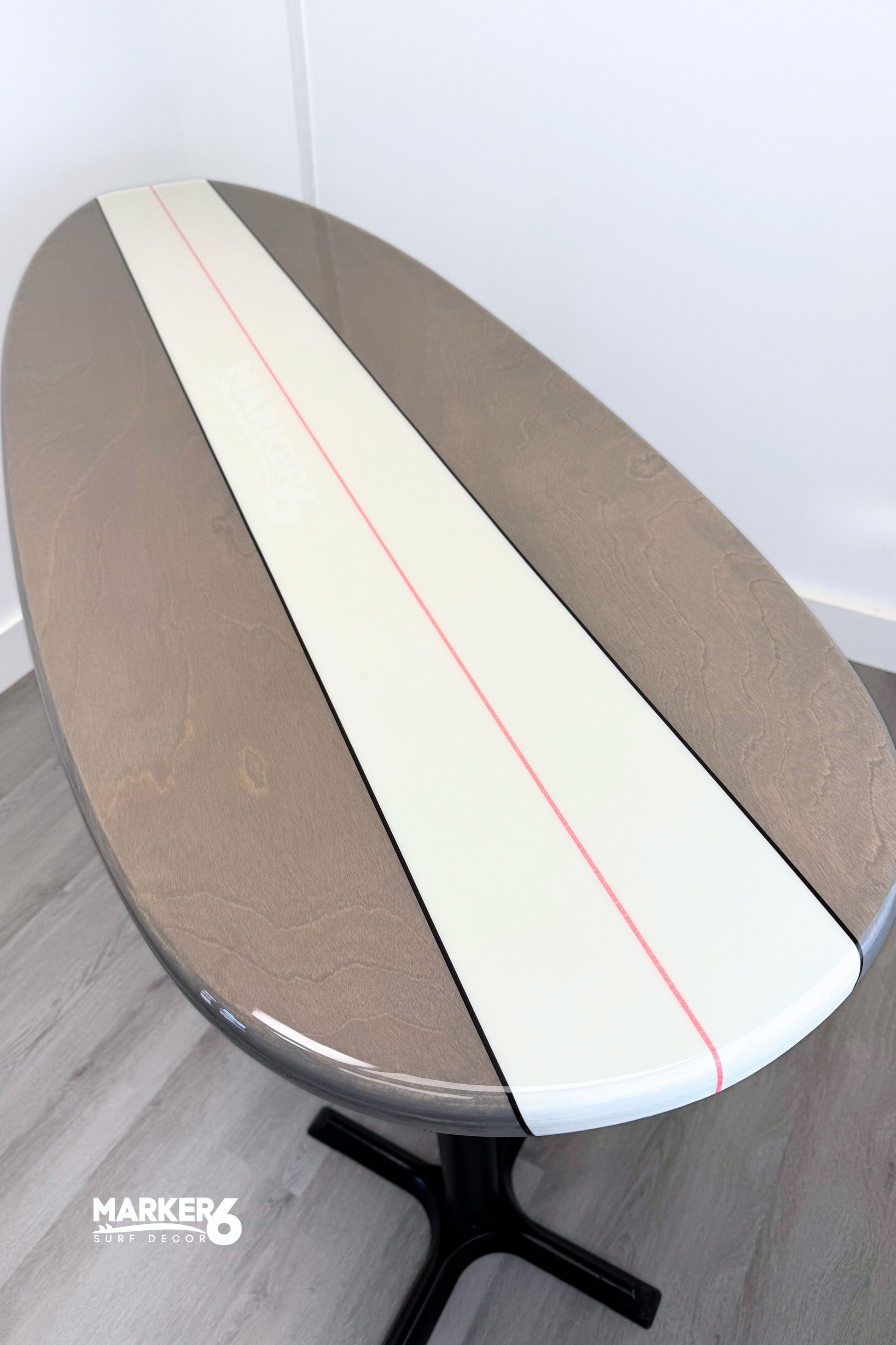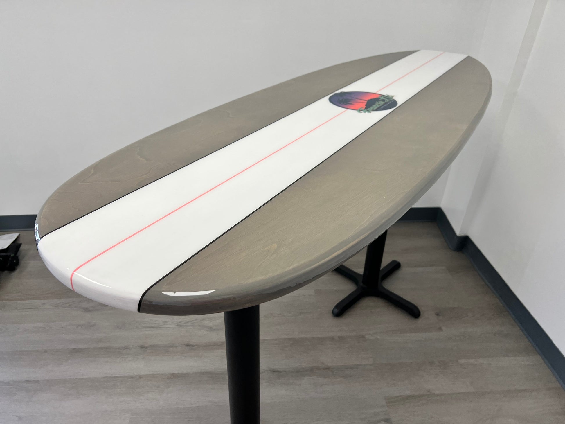 The Salty Padillac surfboard bar top is the piece of furniture you need when you want to feel nostalgic. Featuring a gray stain reminiscent of an old weathered beach cottage, a white center and crisp pinstripes. The glossy thick epoxy makes it perfect for summer nights and shrimp boils, games and memories. It feels perfectly coastal.